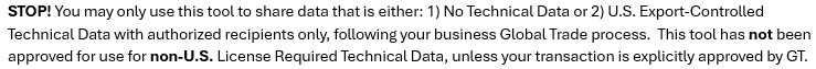 · NOTE: If your file(s) contain non-U.S origin export-controlled Technical Data (for example, Canadian Controlled Goods, UK MOD Official), STOP and seek further guidance from GT. This tool has not been approved for use for non-U.S. License Required Technical Data, unless your transaction is explicitly approved by GT.